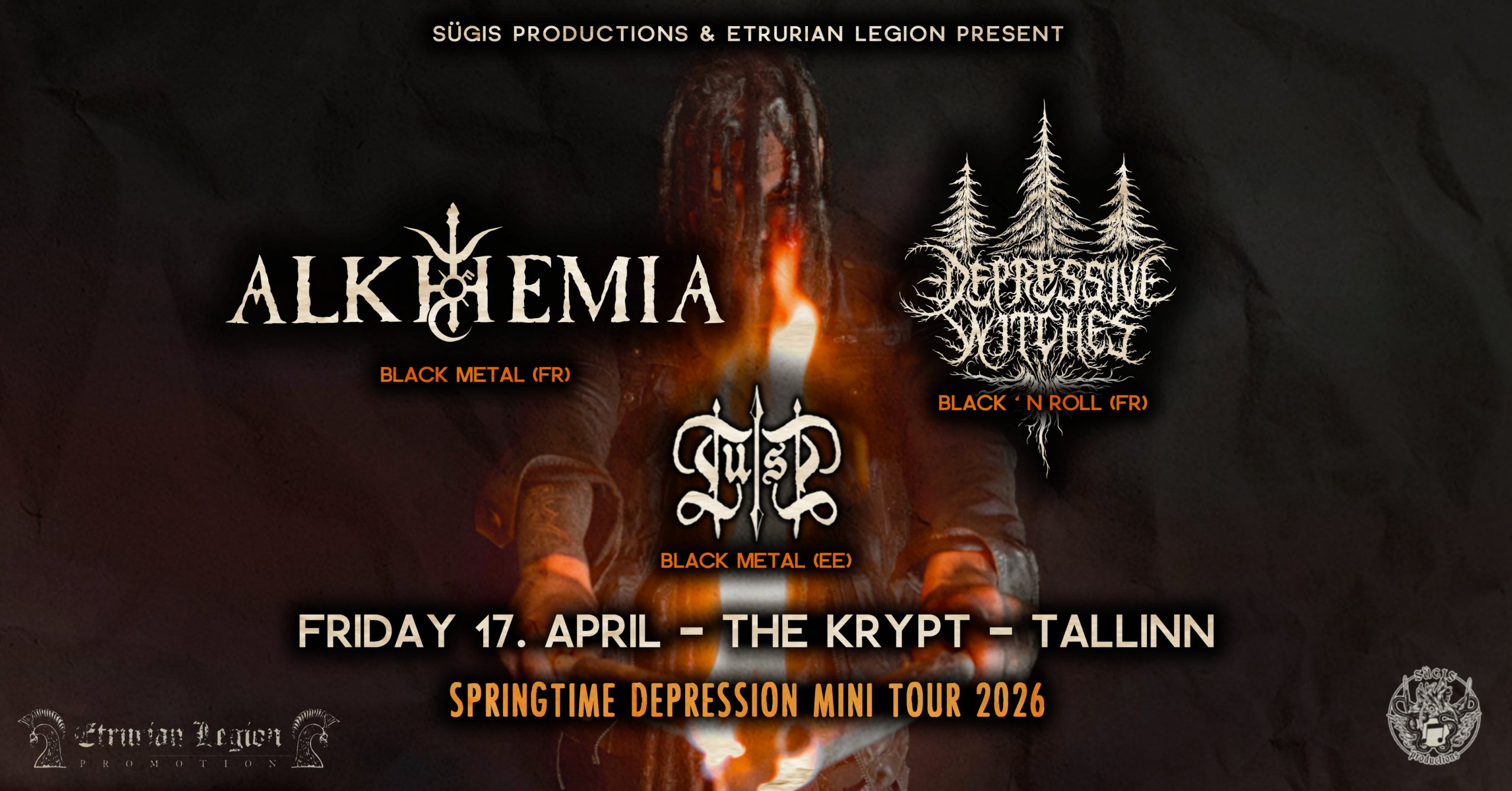 On ๐ ๐ซ๐ข๐๐๐ฒ, ๐๐ ๐๐ฉ๐ซ๐ข๐ฅ, The Krypt welcomes ๐ญ๐ฐ๐จ ๐ ๐ซ๐๐ง๐๐ก ๐๐ฅ๐๐๐ค ๐ฆ๐๐ญ๐๐ฅ ๐๐๐ง๐๐ฌ to Estonia ๐๐จ๐ซ ๐ญ๐ก๐ ๐๐ข๐ซ๐ฌ๐ญ ๐ญ๐ข๐ฆ๐: ALKHEMIA and DEPRESSIVE WITCHES, joined by local support TUISK.